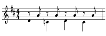 La melodía está basada en las notas de la triada del acorde de Re mayor, principalmente su fundamental y quinta, dándose sólo una parte en que se canta la tercera en el registro agudo. La obra comienza con la nota LA grave, luego el RE y el LA en la octava, y en contadas ocasiones llega a FA#, para culminar la canción con un LA dos octavas mas arriba del inicial, seguido por un grito destemplado (figura 3). Este diseño triádico que evita el grado conjunto puede ser catalogado como fanfarria, concepto usado en la etnomusicología para clasificar diseños melódicos de tradición oral que recurren a los intervalos de la triada mayor, lo que sería evidente en el caso expuesto. Al respecto nos dice la investigadora argentina Ana María Locatelli, apoyándose en Curt Sachs: